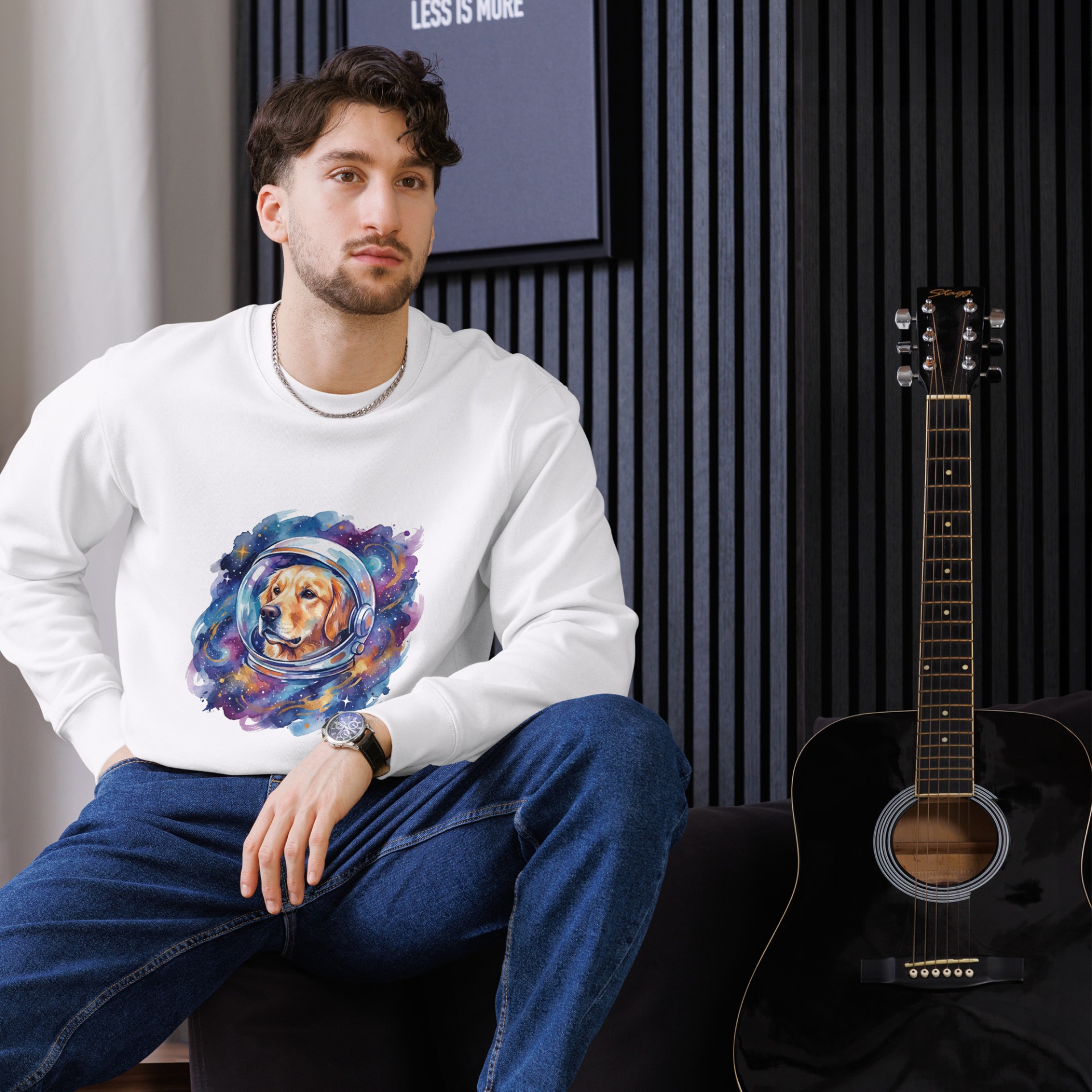 Verleihe deinem Kleiderschrank ein galaktisches Upgrade! Unser Hund im All Sweatshirt kombiniert ein einzigartiges Design mit höchstem Tragekomfort. Dank der Herstellung aus 100 % ringgesponnener Bio-Baumwolle ist dieser Unisex-Pullover nicht nur weich auf der Haut, sondern auch ein Statement für umweltbewusste Mode-Liebhaber.