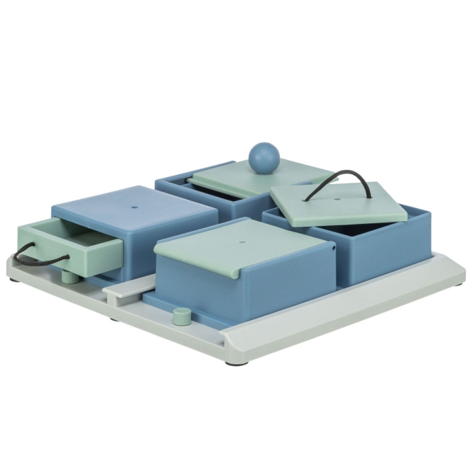 Mit seinen Maßen von ca. 25 x 20 cm bietet das Spiel eine kompakte Plattform für interaktive Herausforderungen. Es wurde entwickelt, um die natürlichen Instinkte des Hundes zu wecken und seine Problemlösungsfähigkeiten zu trainieren.