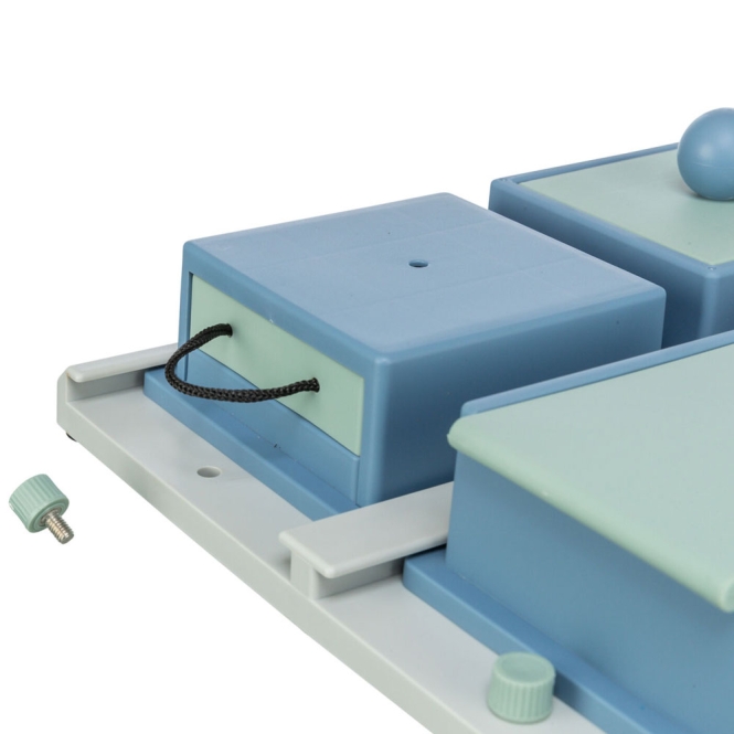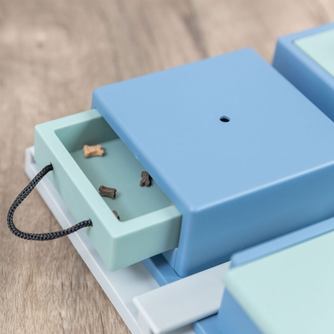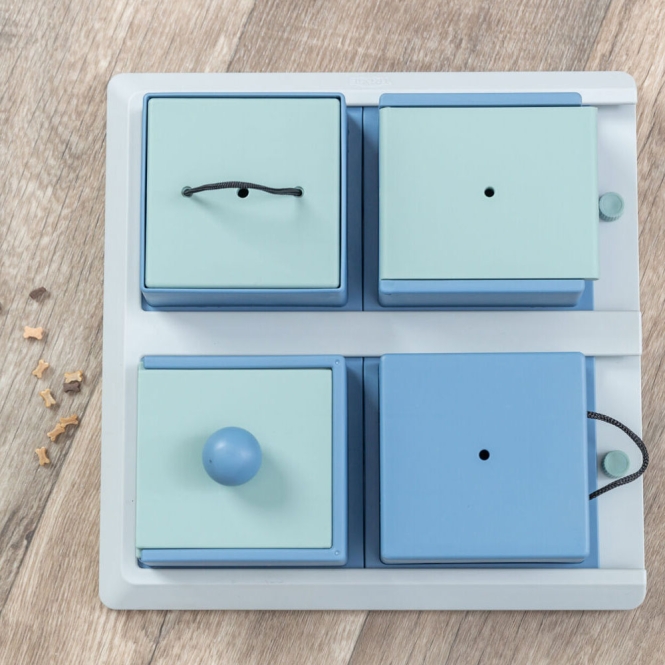 Die Basis der Poker Box 1 bildet eine stabile Spielbox (ca. 31 x 10 x 31 cm), in die vier separate Fächer eingearbeitet sind. Der Clou: Jedes dieser Fächer verfügt über einen unterschiedlichen Öffnungsmechanismus. Durch das Verstecken von Leckerlis in diesen Fächern wird der natürliche Entdeckerdrang Ihres Hundes geweckt. Ihr Hund muss nun lernen, die verschiedenen Mechanismen – wie Ziehen, Klappen oder Schieben – korrekt zu betätigen, um an seine Belohnung zu gelangen.
