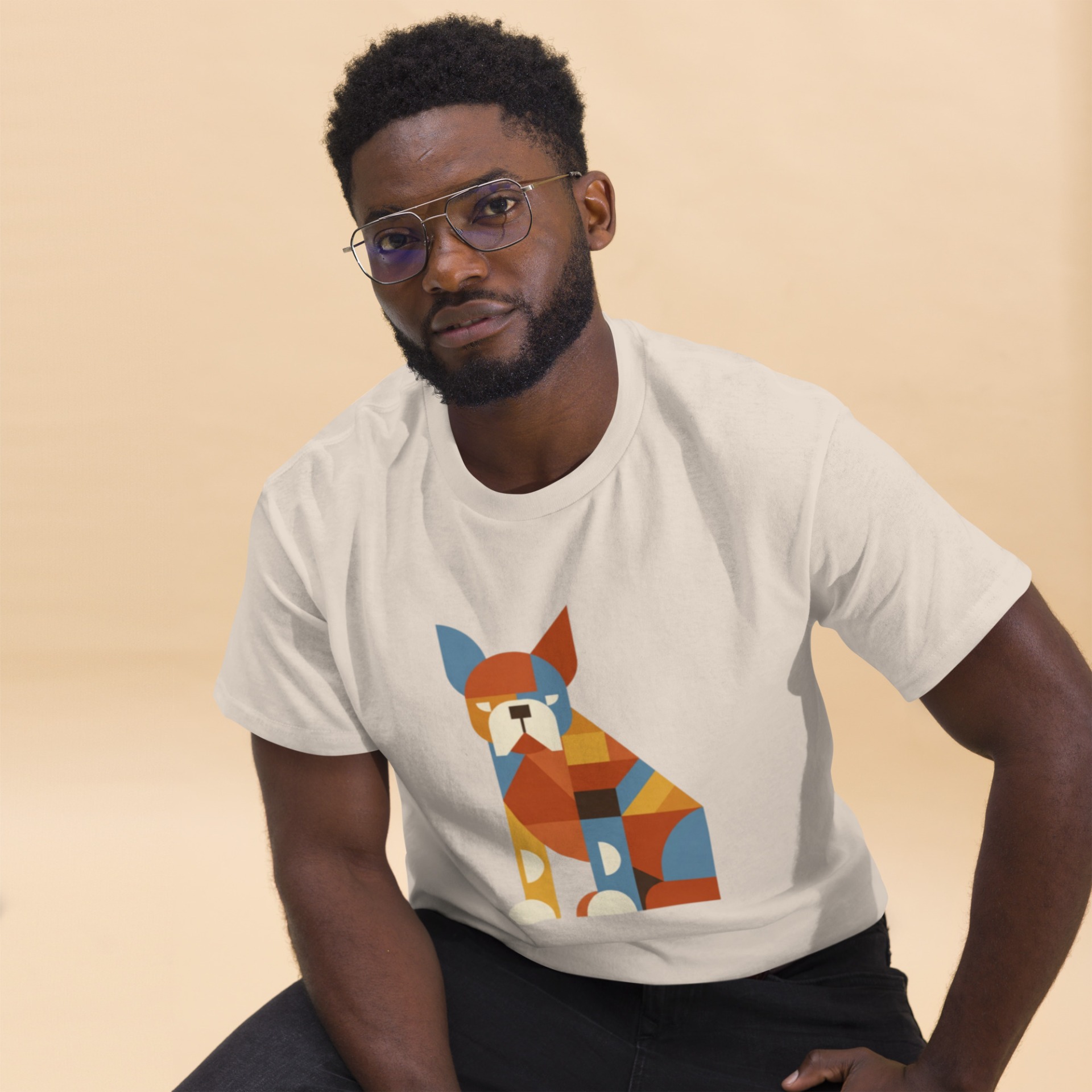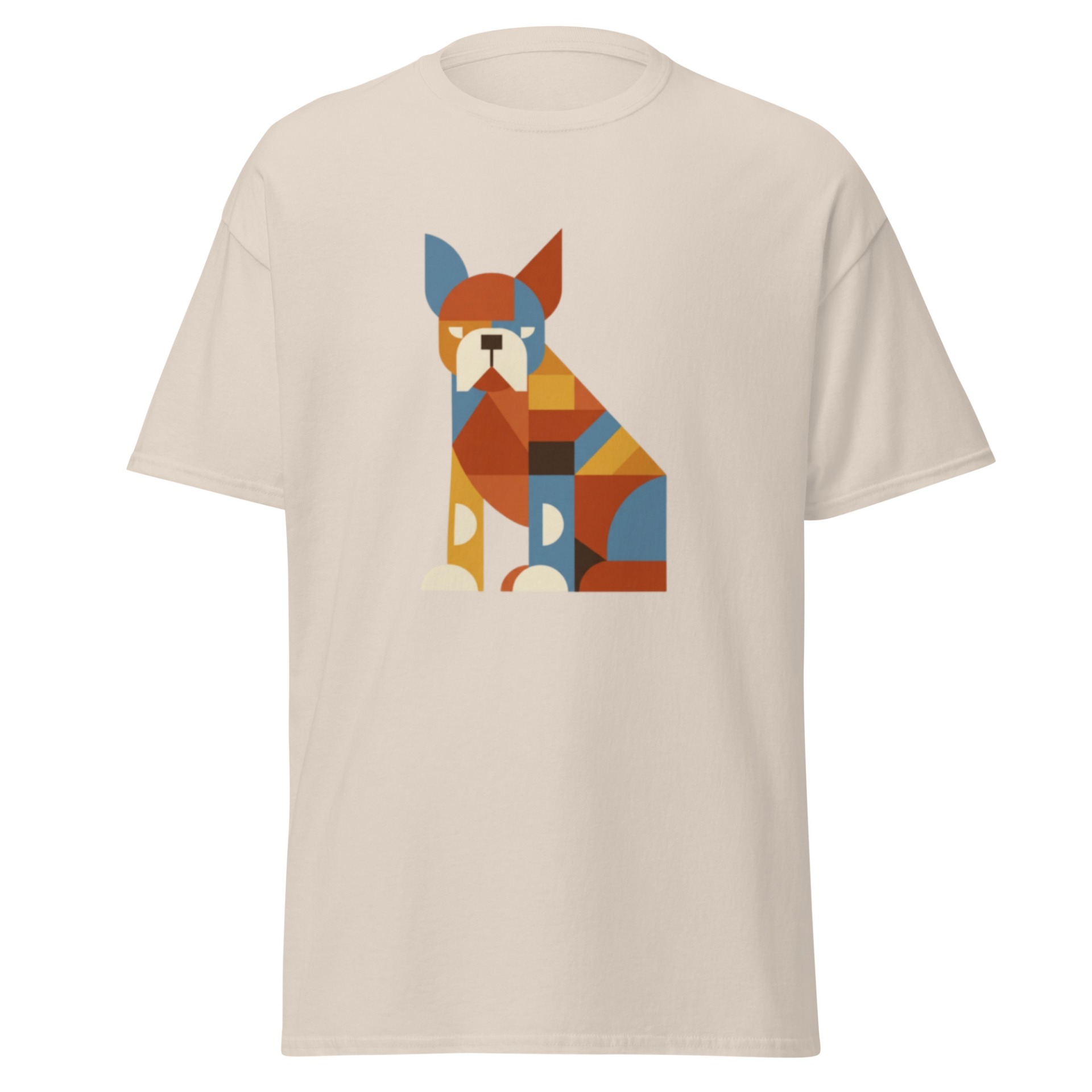 Vergiss klassische Fotodrucke – hier kommt Kunst auf Baumwolle! Unser Klassisches Unisex T-Shirt in der Nuance „Natural“ zeigt ein abstraktes Bulldoggen-Motiv, das durch klare Linien und harmonische Erdtöne besticht. Inspiriert von moderner Geometrie, ist dieses Shirt die perfekte Wahl für alle, die ihren Vierbeiner stilvoll im Alltag repräsentieren wollen.